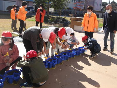 1年生が、本日の2校時にチューリップ交流会を行いました。このチューリップ交流会は、更生保護女性会が実施しているものです。今回は、5名の方が本校にお越しくださいました。チューリップの合言葉(正義)のような1年生になってほしいという願いを込めて、更生保護女性会の方々と一緒に球根を植えました。