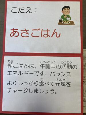 持久走大会に向けて、保健室前の掲示物がリニューアルされました。〇〇〇〇〇は食べましたか?〇に入る言葉は、あさごはんです。朝ご飯は、午前中の活動となるエネルギーです。バランスよくしっかり食べ、元気をチャージしてほしいと思います。