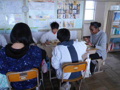 授業のあとは、6年生と給食を一緒に食べました。少し、苦手な日本料理もあるということです。楽しい交流がもてました。
