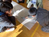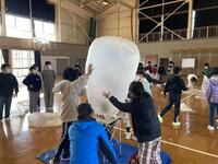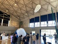熱気球について説明(なぜ、空気を温めると上昇するか等)をしていただいた後、グループに分かれ、ミニ気球を作りました。出来上がった気球をバーナーで暖めると、あっという間にあっという間に体育館の天井に上がっていきました。