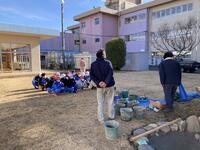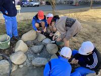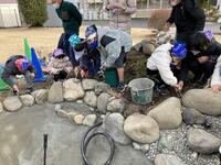 石の間の隙間をモルタルで埋める作業を行いましたが、児童は協力しながら楽しく作業をすることができました。