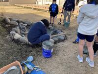 ビオトープ造成工事(もちのき広場環境整備事業)3日目の様子です。今日は4~6年生で、石の間ににモルタルを塗る作業を行いました。新型コロナウイルス感染症の感染拡大防止の観点から、業間の休み時間に5年生。昼休みの前半を4年生、後半を6年生として学年別に行いました。
