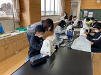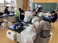 5年生の家庭科の授業では、ミシンを使ってエプロン作りを行っています。ミシンの操作が初めてということもあり、学校支援ボランティアの方々の協力仰ぎ実施しています。