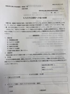 6月24日(金)に、今年度のもちのき応援隊への応援依頼のプリントを保護者及び地域に皆様に配付しました。