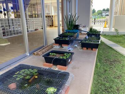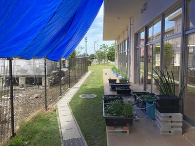 今日は、多目的ルームの南側テラスで飼育している金魚やメダカの水槽の水温が上がらないようビニールシートで、簡易の日よけを作りました。これで、少しは、金魚やメダカが快適に過ごせると思います。