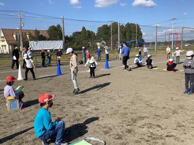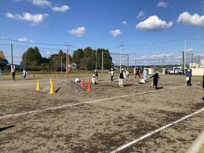 3・4年生 体育 「タグラグビー」ボールを後ろにしか投げられないというラグビー特有のルールのもと、パスの練習をしました。その後、チームに分かれてゲームを行いました。チームで作戦を立て、楽しくゲームを行っていました。
