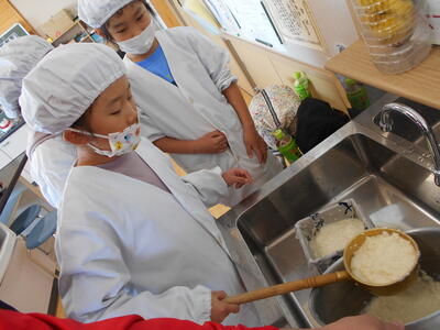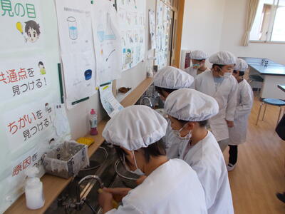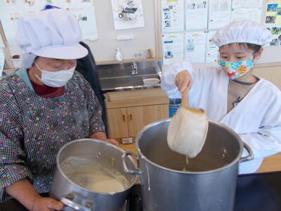学校支援ボランティア2名の協力を得て、3年生が、豆腐作りを行いました。国語「すがたをかえる大豆」と総合的な学習の時間で行っている「植物栽培」関連しており、教科を横断した授業として実施しました。