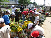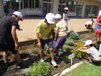 ボランティアの方に来ていただき、4年生がヒョウタンの苗を教材園に植えました。植える時のコツを教えていただき、全員で作業しました。