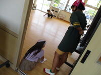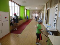 分担が終わった班は、早速それぞれの場所をきれいにしていました。高学年が低学年に清掃のしかたを丁寧に教える様子も見られました。