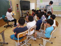 児童は、ウサギについての説明を聞いたあと、抱っこしたり心音を聞いたりして実際にウサギに触れることができました。また、本校で飼育しているクジャクを見ながら、クジャクのことについて、獣医さんにお話を聞くこともできました。