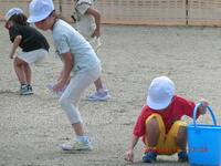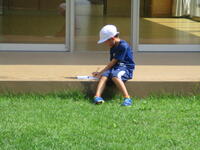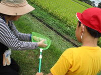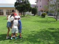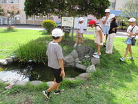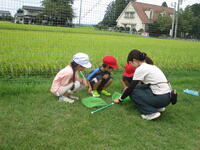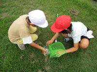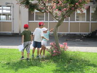 1年生が、生活科「いきものと なかよし」の学習で虫さがしをしました。子供たちが校庭の中で虫がいそうなところを予想し、そこで虫さがしをしました。校庭のグリーンベルトやもちのき広場は、自然の状態とは環境が若干違いますが、カエルやバッタ、トンボなど多くの生き物を見つけることができました。