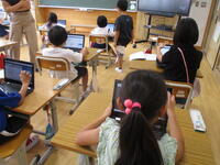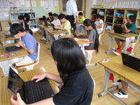 【4年生】担任とICT支援員による授業です。プレゼンテーションソフトの使い方を学んでいました。