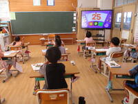 【1年生】算数で、今日の学習に関連した「5とばし」の数を唱えていました。動画を使って学んでいました。
