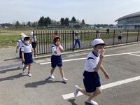児童は、教員の指示を聞き、お(押さない)か(駆けない)し(しゃべらない)も(戻らない)のお・か・し・もを守り、真剣に取り組みました。