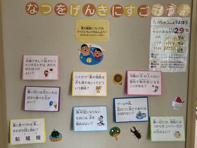 保健室前の掲示物が新しくなりました。「夏を元気に過ごそう!」です。熱中症、新型コロナウイルス感染症に注意しながら、元気にこの夏を乗り切ってほしいと思います。