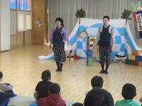 「風の子ぴーぷーぴーふゃら団」という演目の公演でした。あらすじは、ぴーぷー団が作った秘密基地にぴーふゃら団が攻めてきて遊んで帰っていくとういものですが、その遊びとは、コマや紙風船、けん玉、紙芝居、おもちゃ遊び等、昔懐かしい遊びでした。劇団の方の上手な遊びにビックリしながら子どもたちは、夢中になって劇に見入っていました。現在は、ゲームで遊ぶことが多いと思いますが、皆で一緒になって遊んだ昔の遊びに興味をもったのではないでしょうか。