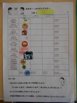 先週から2年生が木曜日の朝の学習を活用し、「かけ算マスター」にチャレンジしています。マスターへの道は3つの段階があり、①前から順に唱える □×1 □×2… ②後ろから順に唱える□×9 □×8… ③ランダムに唱える の完全クリア制度です。校長室、職員室、保健室、2年教室、スタディールーム、算数ルームにいる先生方にかけ算九九の暗唱を聴いてもらい、合格できたら印をもらい次に挑戦しています。「ただ順番に言えるだけでなく、環境を変えた様々な場面でもかけ算九九が言えるようになり、完全にかけ算九九を自分のものにしてもらいたい」という担任の熱い思いが込められた取組みです。これは本校の校長の学校経営ビジョンや学校課題の【学力向上】に沿った取組みの一つです。「努力に勝る宝なし。」今後もこのような地道な取組みを学校全体で取り組んでいきたいと思います。