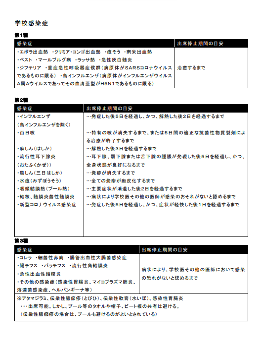 お子さんが下記の感染症にかかった場合は出席停止扱いとなりますので、速やかに学校に申し出てください。