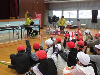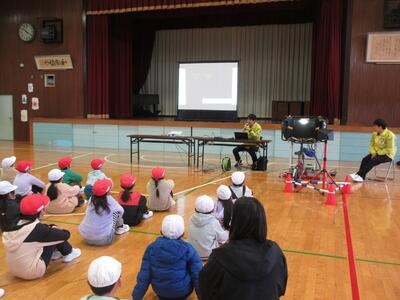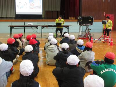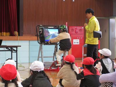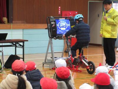 自転車は車両の仲間であり、守るルールがたくさんあることなどを教わり、その後、代表児童が自転車シュミレーターに挑戦しました。