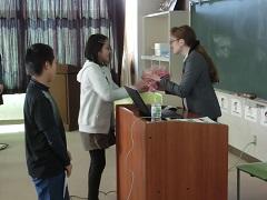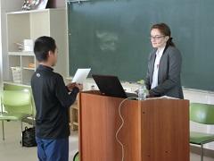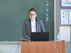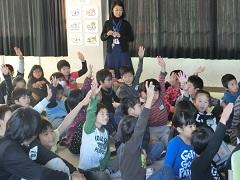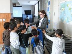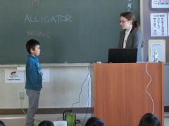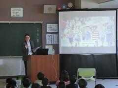 上高小英語Monthも今日が最終日です。県国際交流員のカエル・ダント先生を招聘し、国際理解集会を行いました。母国であるアメリカ合衆国の自然や文化、人種、祝日などについてクイズも交えて分かりやすく説明してくれました。また、出身地のインディアナ州についての説明もありました。下学年では、「ハンド・ターキー(手型で描く七面鳥)」というアメリカに住んでいる子どもが感謝祭の時期によくやっているお絵かきに挑戦しました。