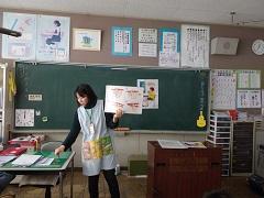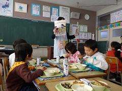 町立学校給食センターの学校栄養士が来校し、1年生に対して食指導が行われました。内容は、食事のマナーに関する話でした。