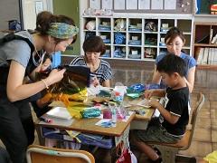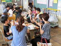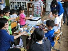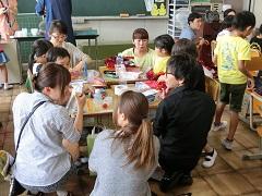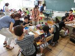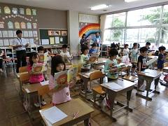 今日は、夏季PTAで授業参観を行いました。1年生は生活科の「みずにうくものをつくってあそうぼう」の授業です。身近な材料を使って水に浮くものを作りました。