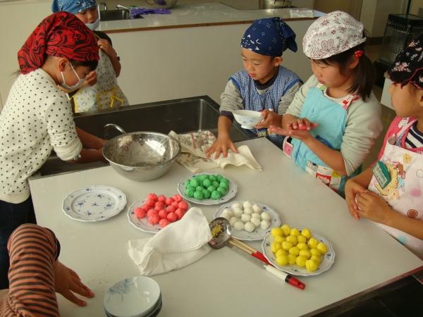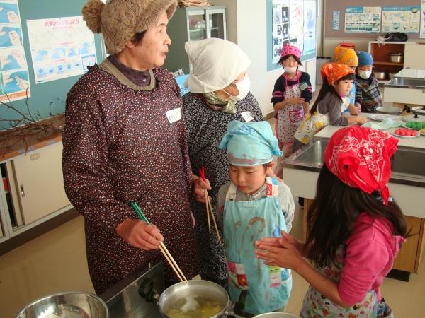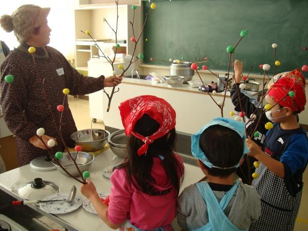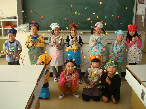 1・2年生が、高齢者とのふれあい学習を行いました。地域の4名の高齢者にお越しいただき、この時期の伝統行事である「まゆ玉飾り作り」をしました。高齢者の方と一緒に、まゆ団子を作り、一つずつ木の枝にさしました。枝に色とりどりのまゆ団子がつくと、みんな歓声をあげて喜んでいました。高齢者の方々と温かい交流を図ることができました。