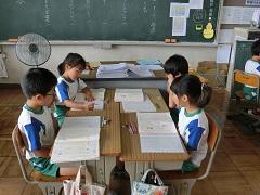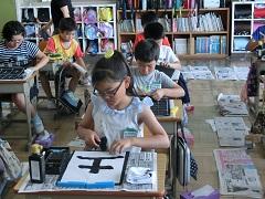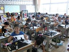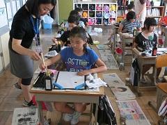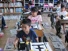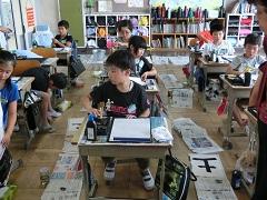 高根沢町在住の鶴見先生と岡田先生が来校し、3年生に書写指導を行いました。毛筆の授業が始まる3年生に、専門的な指導を行うために毎年依頼しています。今日は、今年度最初なので、用具の使い方の説明を聞いた後、大筆を使ってのたて線とよこ線の練習を行いました。子どもたちは緊張しながらも、精神を集中して練習しました。