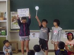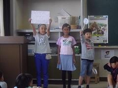 3年生の発表は、生き物に関するクイズです。三択での出題でしたが、全問正解した児童もいました。バイオリンムシの存在を初めて知りました。