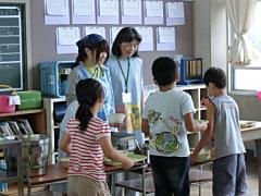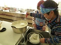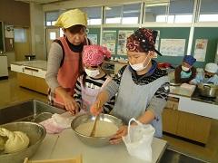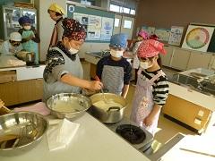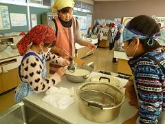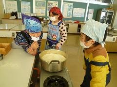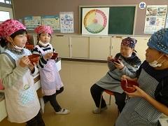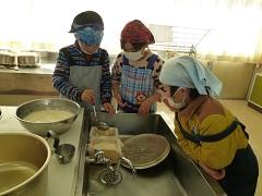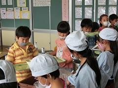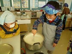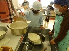 3年生が自分たちで育てた大豆を使って、豆腐作りに挑戦しました。ゲストティーチャーとして直井さんに来ていただき、指導してもらいました。みんなで協力して作った出来たての豆腐は、たいへんおいしかったです。