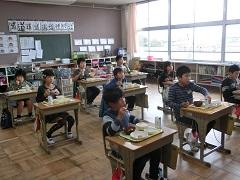5年生が親子ふれあい活動で椅子取りゲームやハンカチ落とし、ドッジボールを行いました。親子で協力してゲームをすることにより、きずながさらに深まりました。その後、教室で一緒においしい給食を食べました。