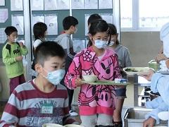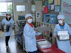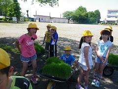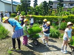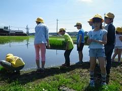 13日(金)に5年生が田植えに備えて、ビニルハウスから田んぼに苗を運びました。苗箱を落とさないように慎重に作業をしました。田植えは、23日(月)に予定しています。