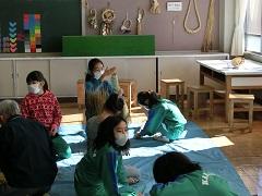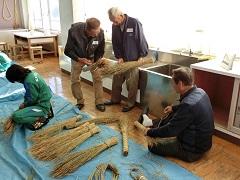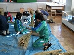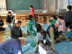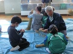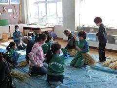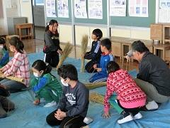5年生が高齢者とのふれあい学習を行いました。高齢者に教わりながらわら細工に挑戦しました。子どもたちは、手際よく作業を行い、予定より早く完成しました。