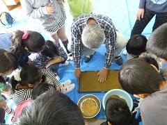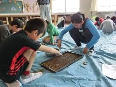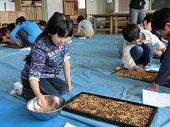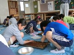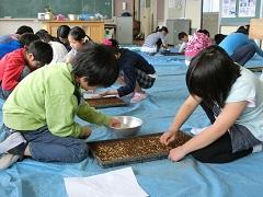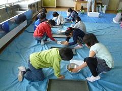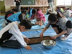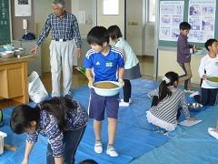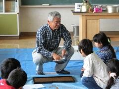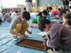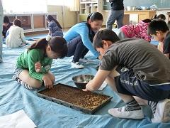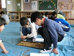 5年生が総合的な学習の時間で米づくりの学習をします。今日は、環境ボランティアの赤羽さんの指導の下、苗床づくりを行いました。苗箱に土をいれ、水をかけた後種もみをまき、土をかぶせました。初めて体験する児童がほとんどでしたが、手際よく作業ができました。さすが5年生と感心しました。今後は、環境ボランティアの岩本さんのビニルハウスを借りて、苗を育て、5月に田植えをします。