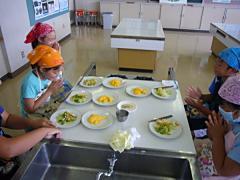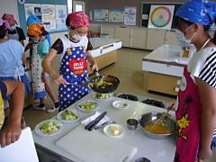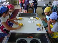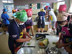 6年生が家庭科の授業で調理実習を行いました。つくったのは、野菜炒めと卵料理です。どの班も協力して調理し、おいしい料理が完成しました。