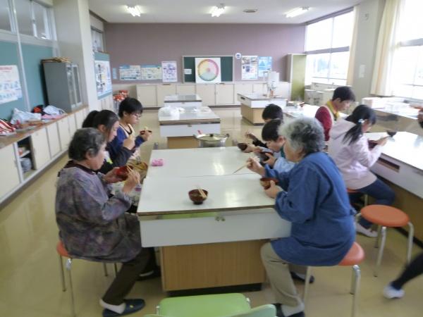 今日は、六年生が「ふれあい学習」を行いました。地域の高齢者5名に来ていただき、戦争体験の話を聞き、一緒にすいとん汁作りをしました。子ども達は、ちょうど今社会科で学習していることもあり、伊奈さんの戦時中の学校や家での生活の様子を興味深く聞いていました。その後のすいとん作りは、手慣れた様子で準備をしました。出来上がったすいとんは、高齢者の方と楽しく談笑しながら食べました。何杯もおかわりする子もいて、みんな大満足の様子でした。