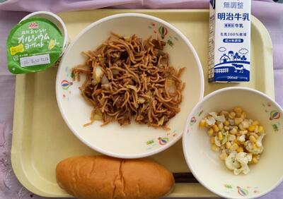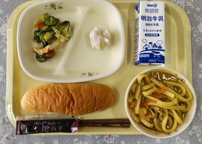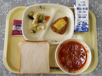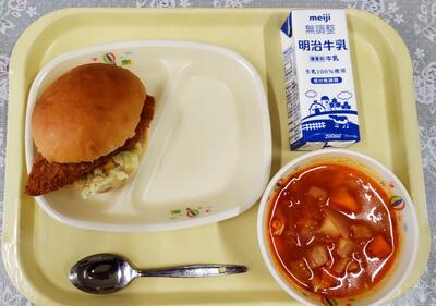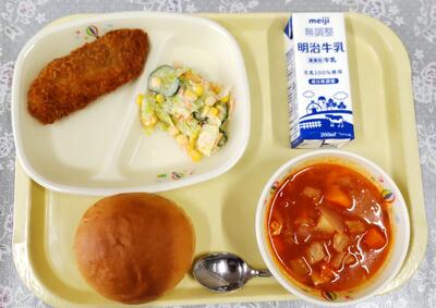 米粉パン、牛乳、マカロニイタリアンサラダ、メンチカツ、野菜とウインナーのスープと、「洋風」メニューでした。今日も美味しくいただきました。ごちそうさまでした。