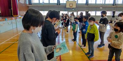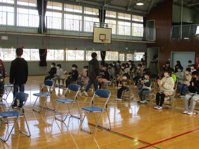 「ようこそ上高根沢小学校へ」児童会主催の1年生を迎える会を開きました。1年生が6年生と手をつないで入場。温かい拍手で迎えました。実行委員の代表あいさつの後、1年生へのインタビューが行われ、名前や好きな食べ物、がんばりたいことを全員はっきりと答えることができました。プレゼントの黄色い王冠をかぶり、ゲームがスタートです。「宝探しゲーム」「ジェスチャーゲーム」「学校クイズ」「箱の中身はなんでしょう」「輪投げ」「魚つりゲーム」の6つのエリアをクリアし、シールをゲットしていきます。1年生のがんばりに、歓声や拍手が送られました。最後に名前入りのプラバン(世界でたった一つの宝物)をプレゼントしてもらいニコニコ笑顔の1年生です。2年生から6年生の皆さん、計画や準備、ありがとうございました。特に6年生は最高学年として、素晴らしい活躍でした。子供たちの笑顔、思いやりの温かい心に包まれた、なんとも心地よい時間と空間でした。