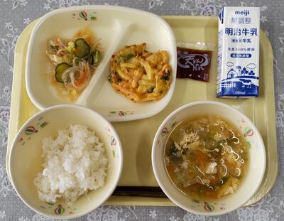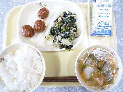 本日のメニューは、ご飯、牛乳、野菜肉団子、チョレギサラダ、水餃子スープです。明日は、一年生が入学して最初の給食ということで、メインが「チキンカレー」で、デザートに「おいわいいちごゼリー」が予定されています。お楽しみに。今日も美味しくいただきました。ごちそうさまでした。