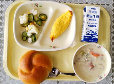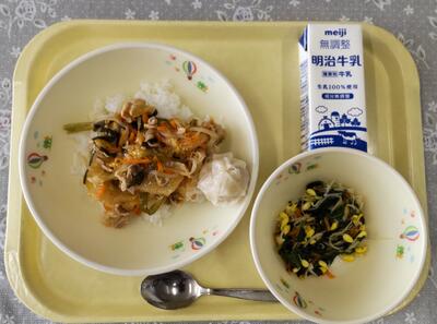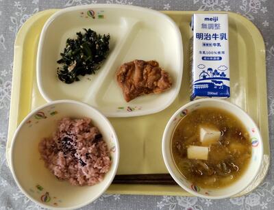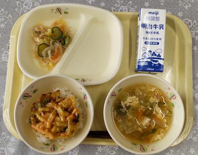 今日は、阿久津中学校1年1組の皆さんが家庭科の授業で考えてくださった献立です。「6つの食品群の中の2群の食品が少なかったので、主食をご飯からわかめを使用しているわかめご飯に変更し、栄養バランスを考えました。汁物は野菜をたくさん摂るために野菜スープにしました。」というコメントをいただきました。