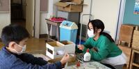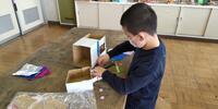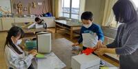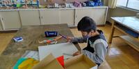 2年生は「算数」の授業です。面をつないで「はこの形」を作っています。
