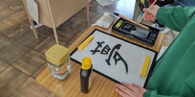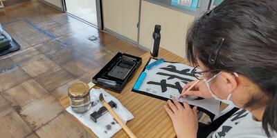 6年生は、「書写」の授業です。未来の自分に送る一文字を書いています。