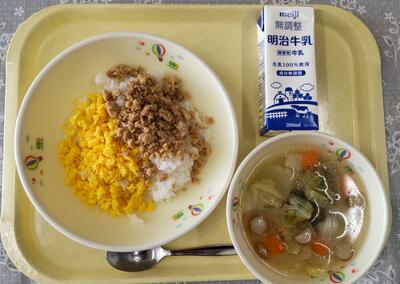 4月最後の給食です。二色丼(大豆入りとりそぼろ、卵そぼろ)、牛乳、キノコけんちん汁です。今日も美味しくいただきました。ごちそうさまでした。来月もよろしくお願いします。