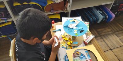6年生は、「図工」の授業です。今日の授業は「夢」がテーマです。未来の自分を作成中です。