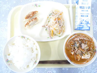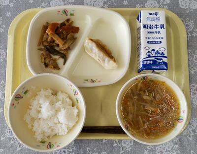 本日のメニューは、ご飯、牛乳、焼き餃子、春雨サラダ、キムチスープです。キムチスープは、辛さ控えめで肉や豆腐、野菜など、具材が豊富です。(写真、右下)今日も美味しくいただきました。ごちそうさまでした。