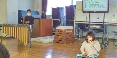1年生は、「音楽」の授業です。「おもちゃのチャチャチャ」のリズム打ちをしています。
