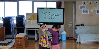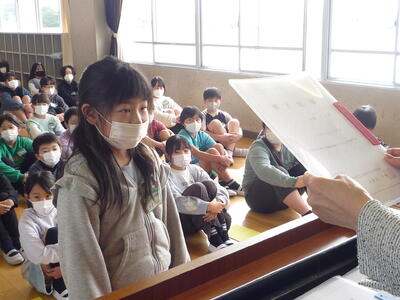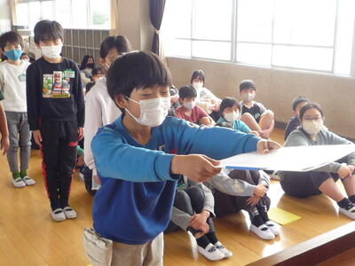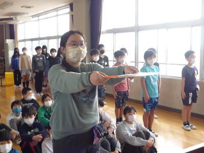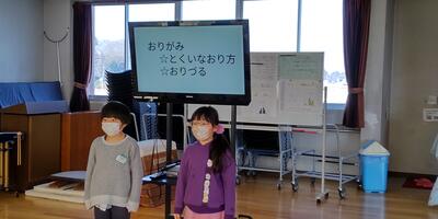 折り紙の発表です。1年生に折鶴のプレゼントもありました。