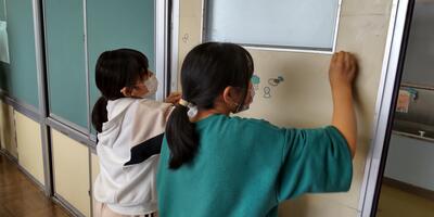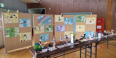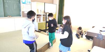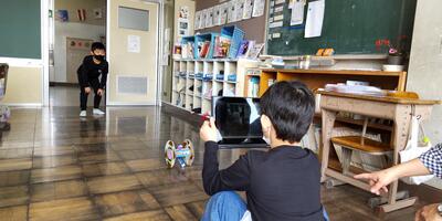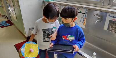 1年生は、図工の時間に制作した作品を動画に撮って、作品発表会の準備をしています。ICT支援員の先生に、動画のコツを教えていただいています。撮った動画を友達と見せ合ってにっこり。