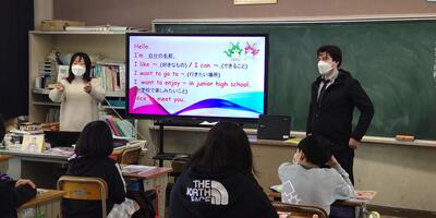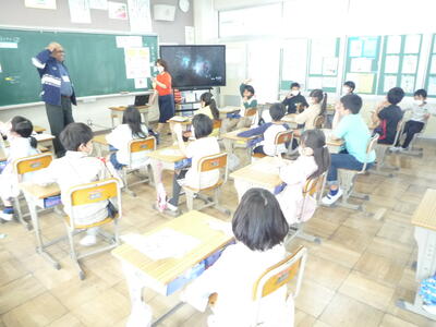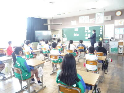 小中一貫教育の一環として6年生対象に、北高根沢中学校英語担当の田邊先生とALTのマシュー先生においでいただき、英語の授業を行いました。まず、中学校での英語の授業を体験させていただきました。次に、自己紹介をしました。最初は、戸惑っていたようですが、すぐに授業に慣れ、笑顔あふれる楽しい活動となりました。直に中学校の先生の授業を受けることにより、雰囲気を体験でき、進学にあたっての不安感も解消された6年生です。