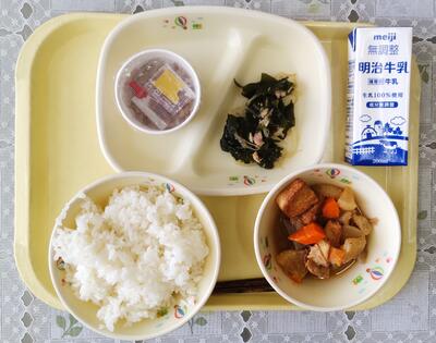 今日の給食は「カミカミメニュー」です。口を動かすと唾液が出やすくなり、様々な働きにより私たちの身体を助けてくれます。今日も美味しくいただきました。ごちそうさまでした。